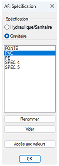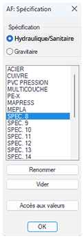 2. Sélectionnez une spécification de routage Hydraulique/Sanitaire ou une spécification Gravitaire > Accès aux valeurs